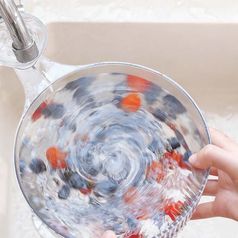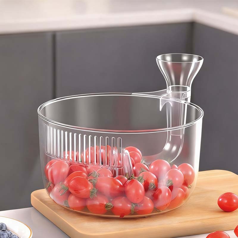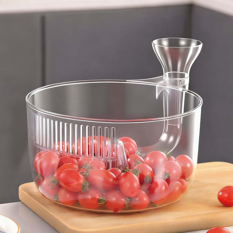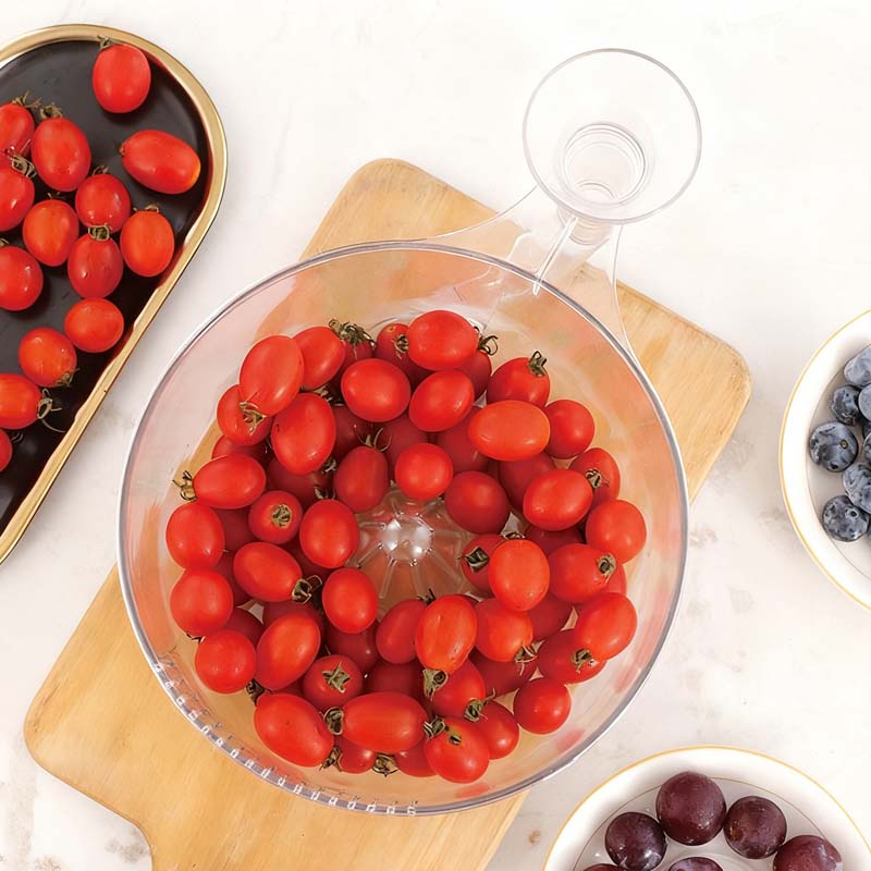 Mycie i odsączanie odbywa się jednym płynnym ruchem. Wewnętrzny kosz obraca się swobodnie, natychmiast oddzielając czyste produkty od brudnej wody. Taka konstrukcja eliminuje potrzebę stosowania wielu pojemników i przyspiesza przygotowywanie posiłków, zapewniając schludne i wydajne miejsce do pracy przy każdym posiłku.
