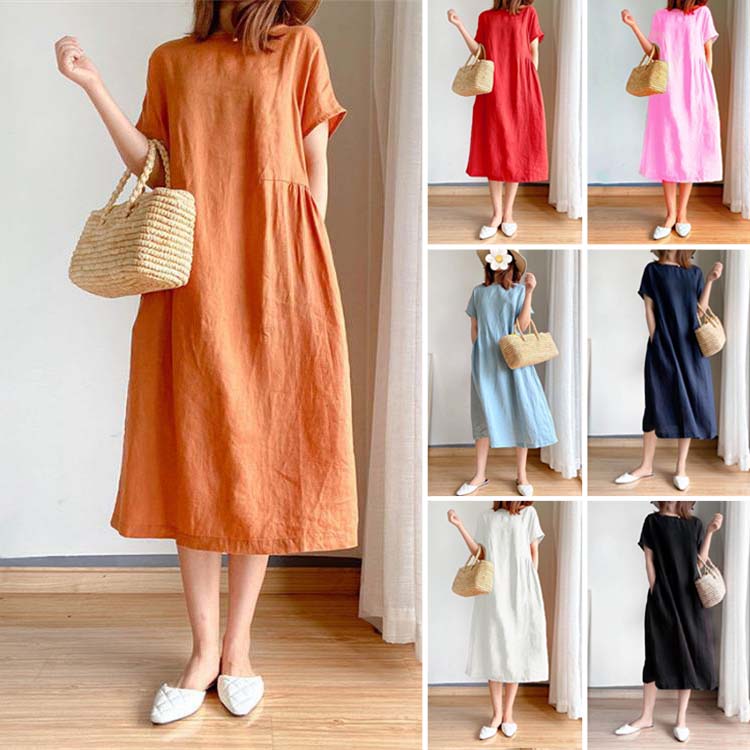 💖Jednokolorowa bawełniana sukienka lniana