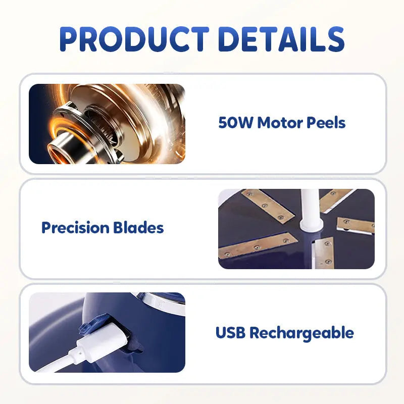 CHYTRÉ ČEPELKY, ŽÁDNÝ ODPAD – Pět ultratenkých nerezových čepelek klouže po slupce, aniž by poškodily ovoce, takže každé jablko, broskev nebo hruška zůstane šťavnaté a plné. Dokonce i jemné hrozny zůstanou bez poskvrny – žádná zbytečná dužina, jen čistá, připravená k jídlu dobrota.