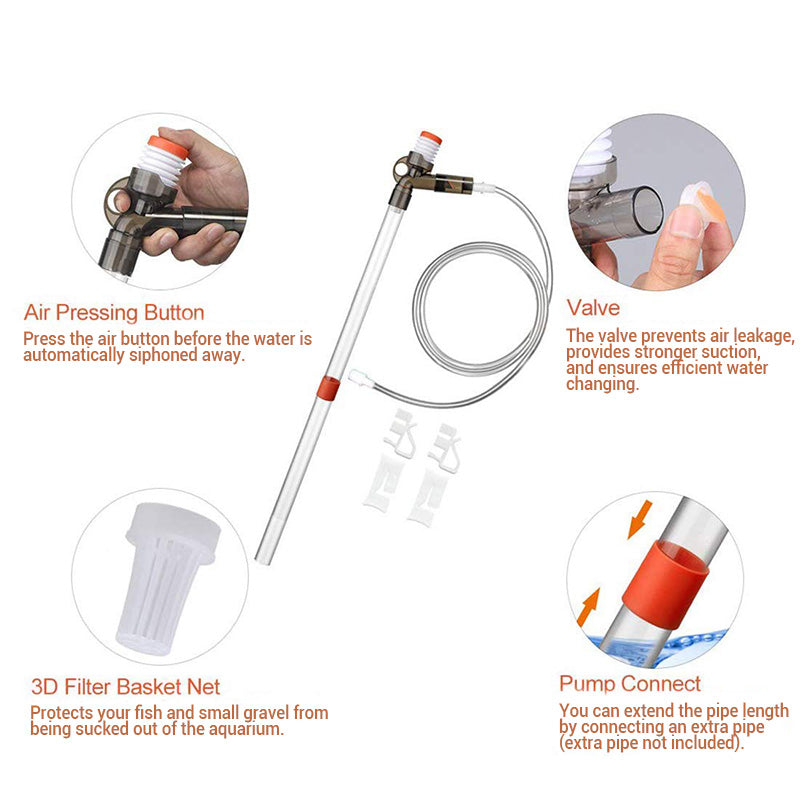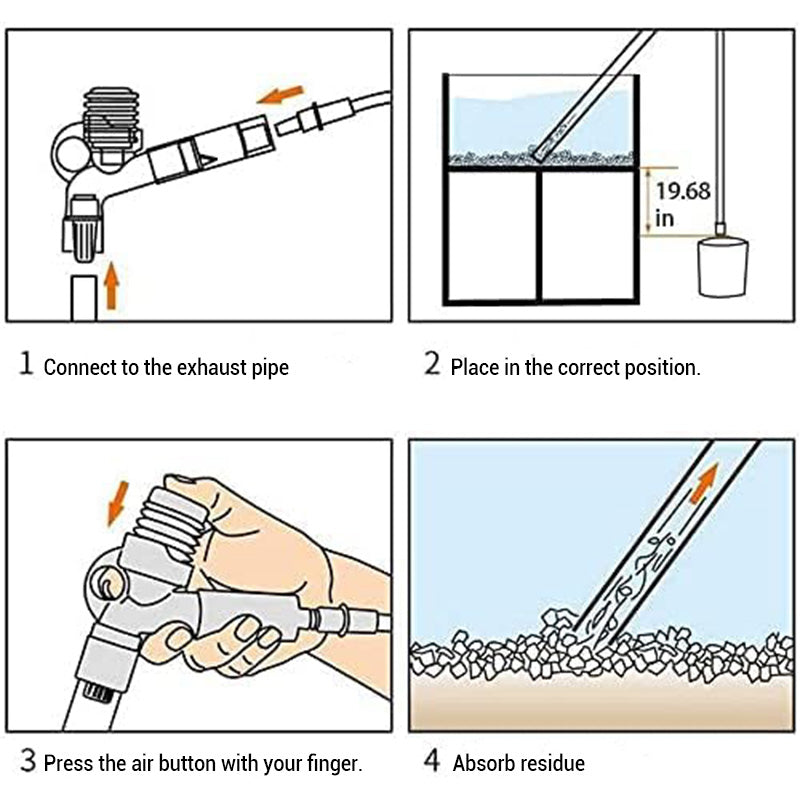 PROSTA OBSŁUGA POMPY POWIETRZA - wystarczy nacisnąć przycisk powietrza, aby uruchomić przepływ wody. Gdy rura wlotowa napełni się, syfon rozpocznie się automatycznie, umożliwiając łatwe prowadzenie odkurzacza w celu precyzyjnej konserwacji żwiru.