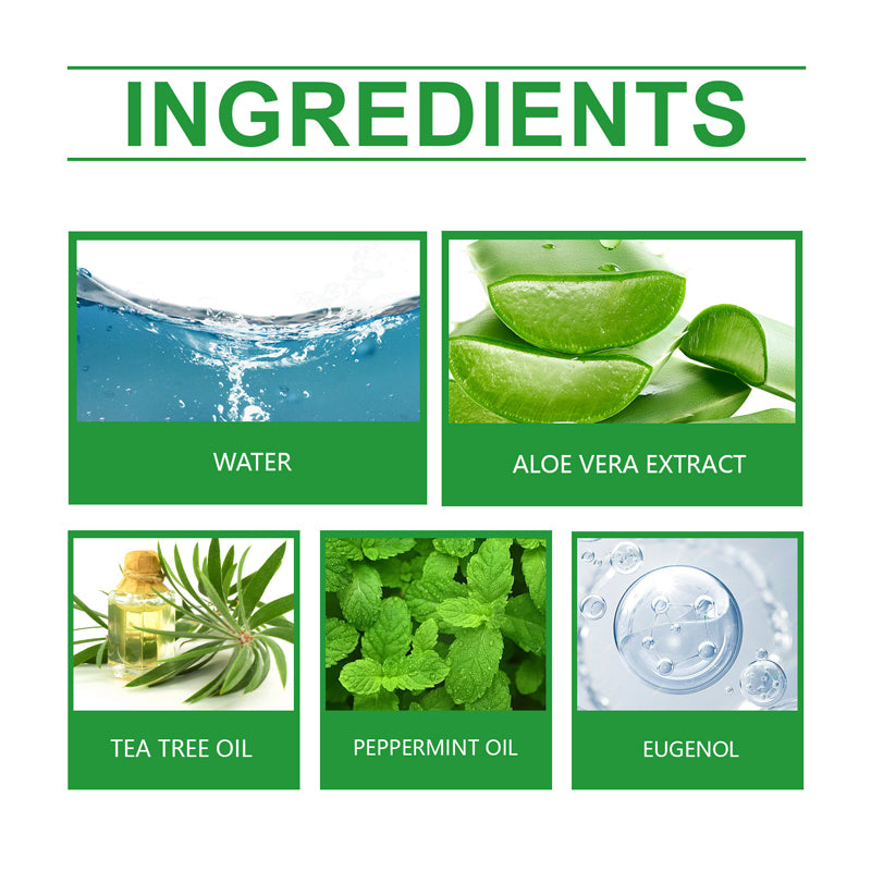 Složení: Voda, Extrakt z aloe vera, Tea tree olej, Mátový olej, Eugenol