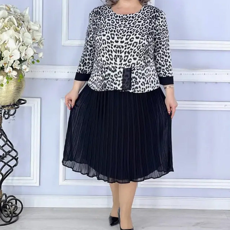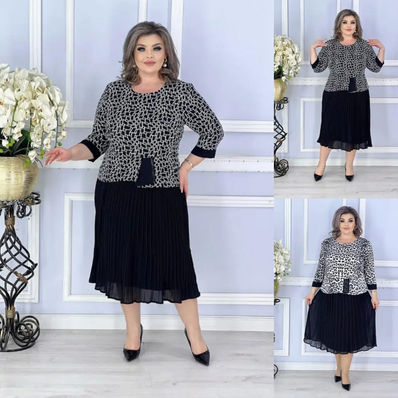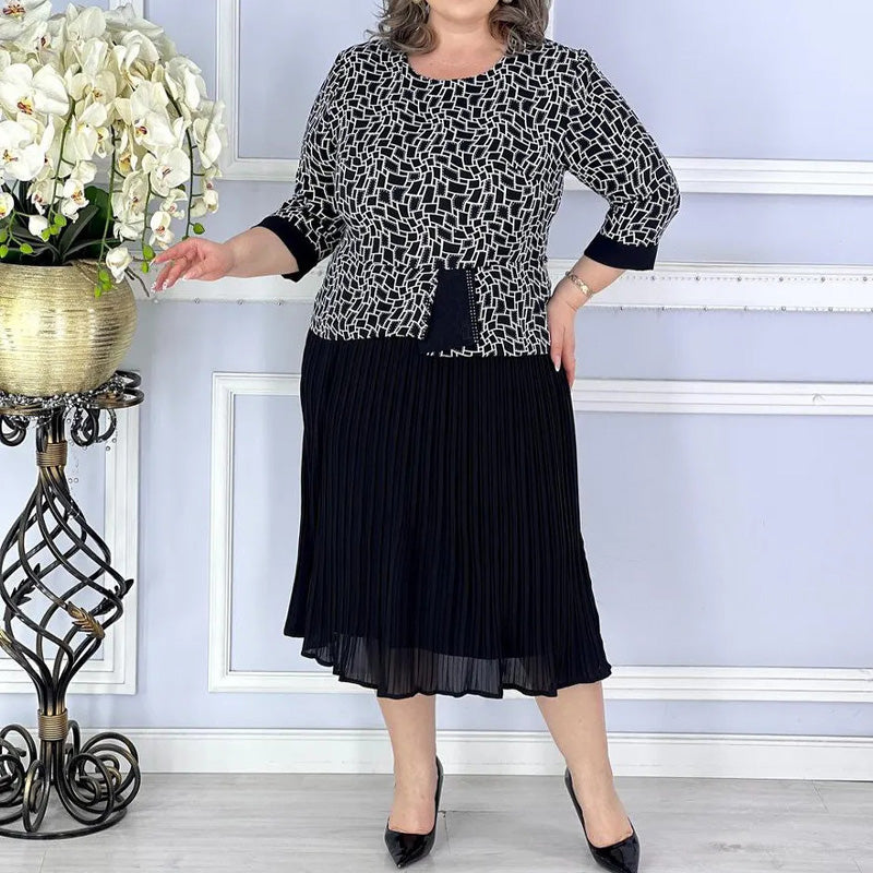 TRENDY DESIGN: Piękny top z nadrukiem i klasyczna czarna spódnica z plisowanej siateczki łączą teksturę i styl, tworząc harmonijny i wyrafinowany wygląd.